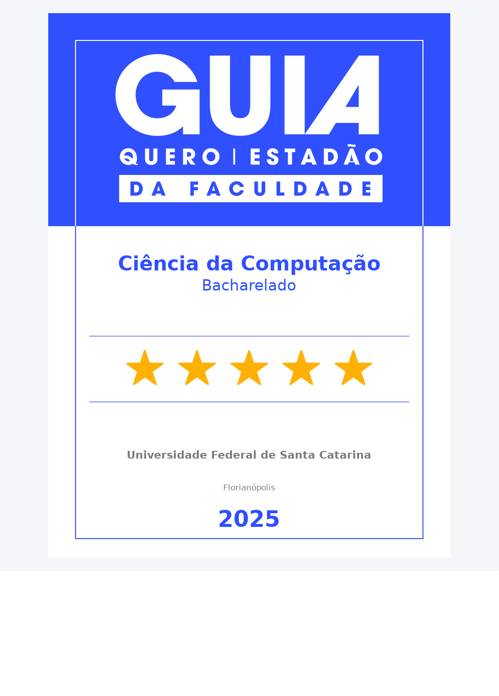 O curso de Bacharelado em Ciência da Computação conquistou 5 estrelas na avaliação do Guia da Faculdade, fruto da parceria entre a Quero Educação e o jornal O Estado de S. Paulo. Dentre os 389 Cursos de Ciência da Computação avaliados, apenas 17 receberam 5 estrelas. Isto mostra o compromisso da UFSC e do Curso de Bacharelado em Ciência da Computação com o ensino de qualidade e a formação acadêmica e profissional de excelência. Mais informações sobre o processo de avaliação e seus resultados estão disponíveis em https://publicacoes.estadao.com.br/guia-da-faculdade/
